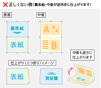 折パンフレットや薄型折り名刺のような折り加工が含まれる商品の場合には、データの天地の向きに注意が必要です。折りを入れることによって仕上がりの向きが逆にならないよう、レイアウトには十分にお気をつけください。