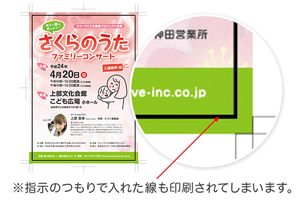 仕上がりの断裁位置に線があると、その線が印刷に反映され、断裁した際に紙の端に入ってしまいます。