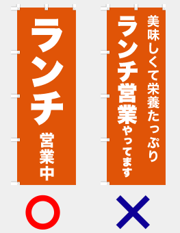 のぼりに盛り込みたい情報は多くても、文字数が多すぎると伝わりにくくなります。そのため、伝えたい情報は1つか2つに絞ることが鉄則です。例えば「ランチ営業中」や「新規会員募集中」など、要点を明確にすることで、通行人にも瞬時に内容が伝わります。フォントサイズを大きく保ち、余白を活かすことで、視覚的にもスッキリとした印象になります。シンプルで的確なメッセージが、効果的なのぼりの秘訣です。