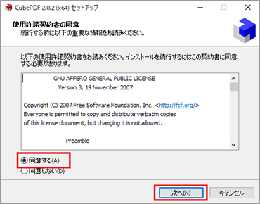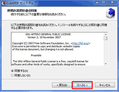 [使用許諾契約書の同意]に[同意する]を選択し、[次へ]をクリックします。