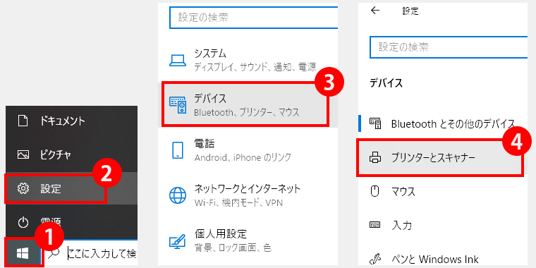 - [スタート]→[設定]→[デバイス]→[プリンターとスキャナー]