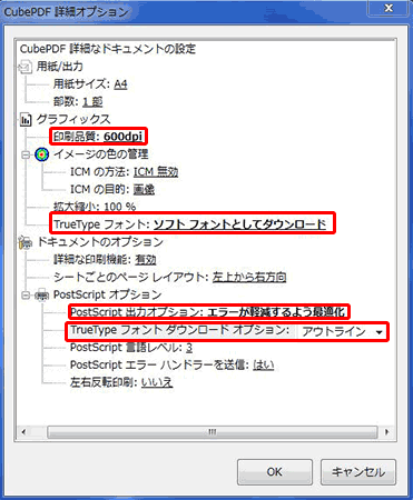 - [PostScript出力オプション]→[エラーが軽減するように最適化]