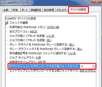 [デバイスの設定]のタブの[アウトラインとしてダウンロードする下限のフォントサイズ]を0ptにします