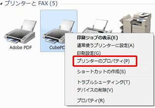 CubePDFの画面で[プリンターのプロパティ]を選択します。