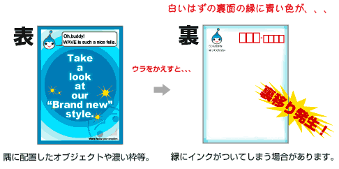 CMYK各色の合計が400%となる『四色ベタ』にしてしまうと、 印刷後のインキが乾燥できずに重なり合った用紙に汚れのように付着してしまいます。 入稿データに4色ベタが使われていた場合、