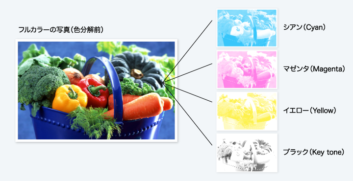 一般的にフルカラーの印刷物は、4色のインキ(シアン C/マゼンタ M/イエロー Y/ブラック K)のそれぞれの版が、重なり合って印刷され、フルカラーが再現されています。