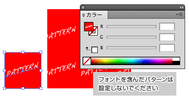 アウトライン化しないでパターンを作成したフォント部分は、後からアウトライン化できず書類情報にも残らないため弊社では発見が困難です。入稿データとは別のフォントに置き換えられて印刷されますので、必ずアウトライン化をしてからパターンにしてください。