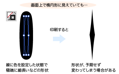 『線』に色を設定して、ベタ面のように表現したり、『線』に色の設定をして作成したオブジェクトが極端に細長い(小さいなどの)形状であった場合、画面上で見えている形状と同じような形状では印刷されない場合があります。