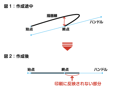 - 更にハンドルと描画線が(Shiftを押すこと等で)直線に重なった場合、終点を越えた描画線は印刷されません。(図2参照)