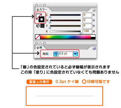 三角形や四角形のような図形であれば『塗り』もしくは『線』のどちらかに色の設定がしてあれば印刷されますが、ペンツールなどで作る「線」には『へアライン』と呼ばれる印刷できない線が存在します。