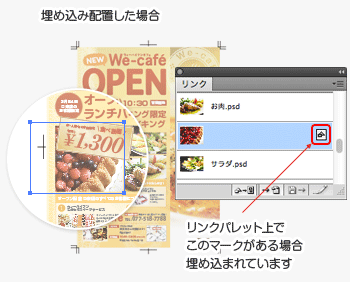 配置するファイルを選択する際に『リンク』のチェックボックスをオフにすることによって、画像が埋め込み配置されます。