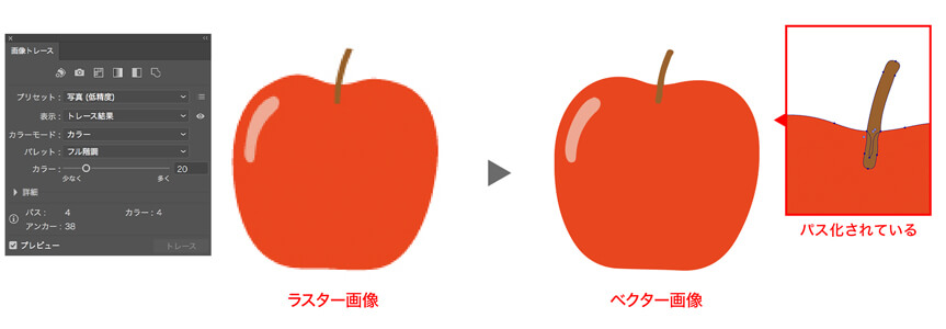 画像トレース機能とは、ラスター画像をベクター画像に変換できるIllustratorの機能です。画像をパス化し、オブジェクトとして配置できます。
