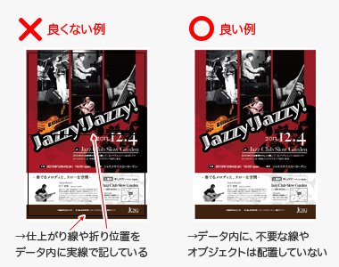 データ内に加工指示を作成されると、印刷に反映されてしまいます。印刷に不要な線・オブジェクトはデータに入れないようご注意ください。