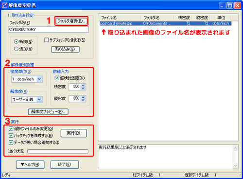 解像度を変更する画像を選択します。右のウィンドウに選択した画像のファイル名が表示されます。