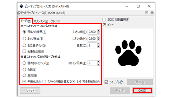 トレースを選択すると、ダイアログボックスが表示されます。 [モード]タブでそれぞれ明るさや色数などを決めます。[OK]を選択するとトレースされます。