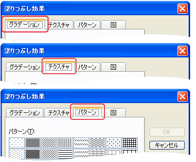 - [書式]→[背景]→[塗りつぶし効果]にあるタブ[グラデーション][テクスチャ][パターン]の全ての効果はご使用になれません。