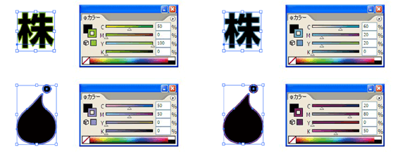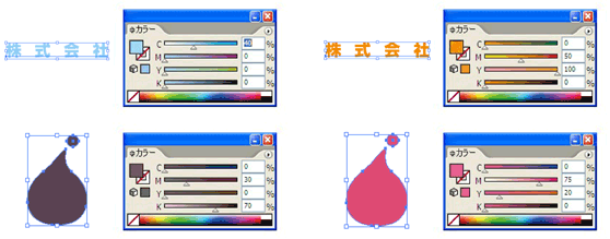 カラーパレットはウィンドウ→カラーで表示されます。カラーパレットのCMYKの値で決める他、