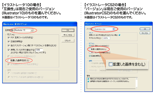 - [バージョン]:必ず作成したバージョンで保存(※異なるバージョンで保存されるとレイアウト崩れや画像が配置されない等のトラブルの原因となります。ご注意ください)