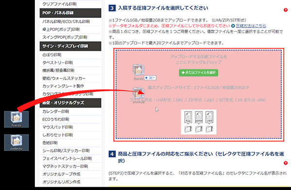 入稿するデータを保存場所から選択し、ドラッグエリア(「ファイルをドラッグ&ドロップしてください。」と記載されたエリア)にドラッグ&ドロップしてください。