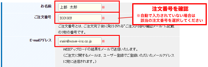 - 初回の入稿時と同じご注文番号をご使用ください。