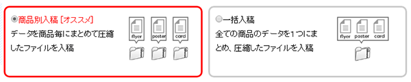「商品別入稿」と「一括入稿」の2種類の方法がございます。どちらかをお選びください。