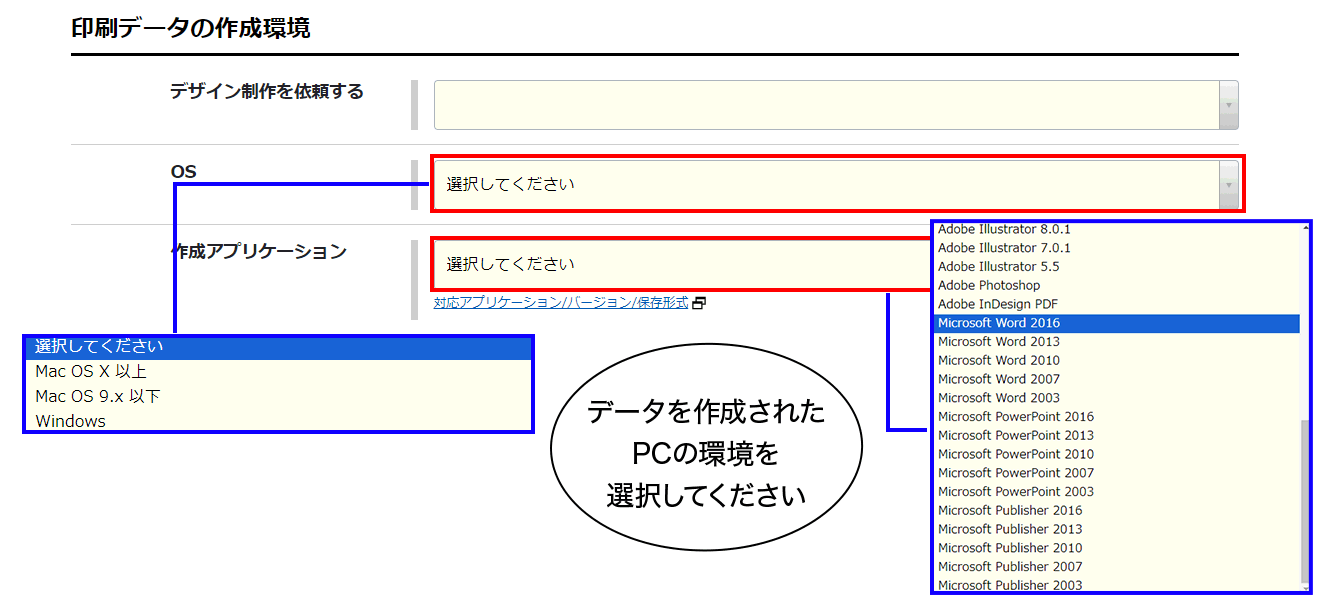 データ作成のPC環境(OS・作成に使用したアプリケーション)を選択してください。