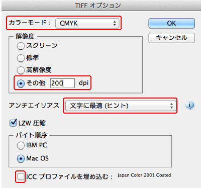- [ICCプロファイルを埋め込む]:チェックオフ