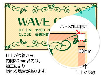仕上がり線から内側30mm以内には文字や重要なオブジェクトを配置しないようご注意ください。