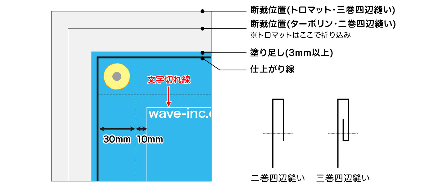 それよりも外側(加工範囲内)に配置されると、縫製やハトメ加工によって、かくれてしまう可能性があります。