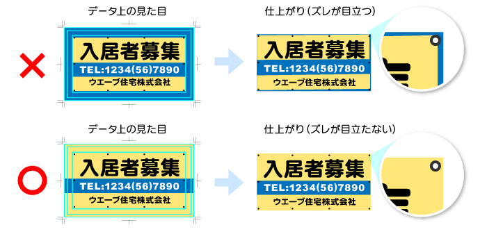 横断幕/懸垂幕は、仕上がりサイズに縫製する際、表面と裏面にわずかなズレが生じます。多少のズレが発生した場合でも問題のないデザインにしていただくことを推奨しております。