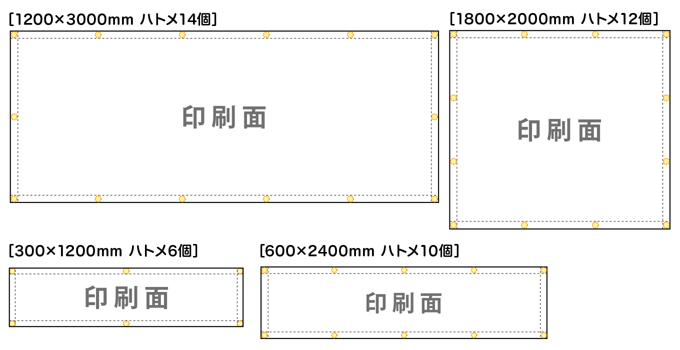 お客様にて、ハトメの位置や個数、間隔をご指定いただくことはできません。ハトメ加工が不要な場合は、ハトメ加工オプションにて「ハトメなし」を選択してくだい。