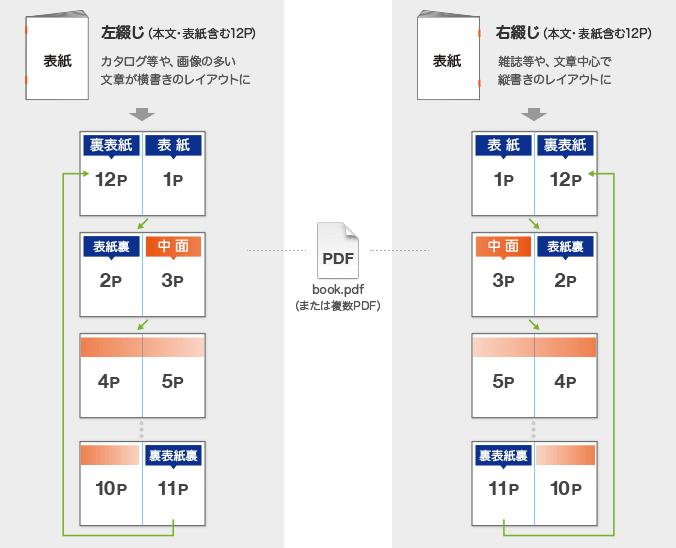 見開きページでのレイアウトの際は、左綴じ・右綴じにご注意いただき、ページ配置が逆にならないようお気をつけください。 ページ配置に関しては、下記の図を参考にご覧ください。
