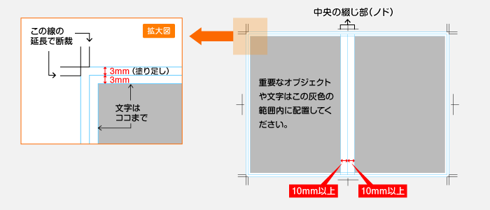 無線綴じ冊子の仕様上、中綴じ冊子のようにページの中央部分まで完全に開ききる事ができないため、中央の綴じ部(ノド)付近は、ページ数が多い冊子ほど見え難くなります。ノド部分には重要な文字やオブジェクトを配置されないことをお勧めいたします。