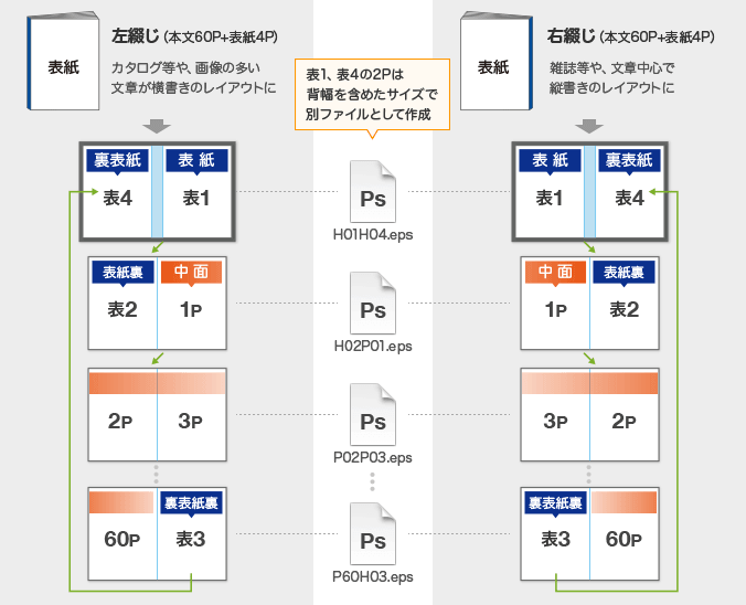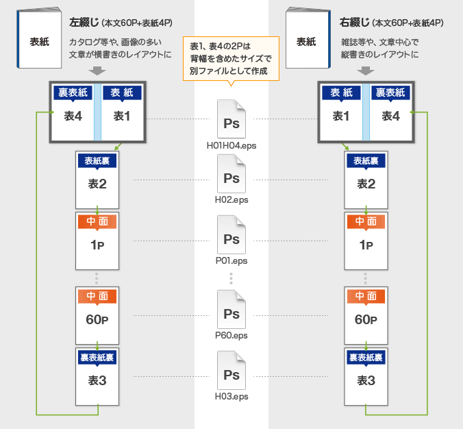 - ファイル名はページ番号がわかるよう記載してください。(H01H04.eps、P01.eps、P02.epsなど)