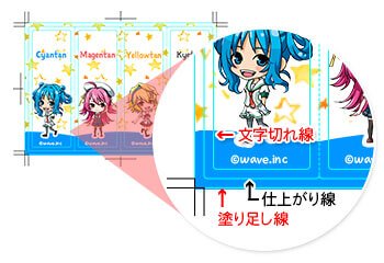 また、切れてはいけない文字やオブジェクトは仕上がり線より3mm以上離して配置してください。
