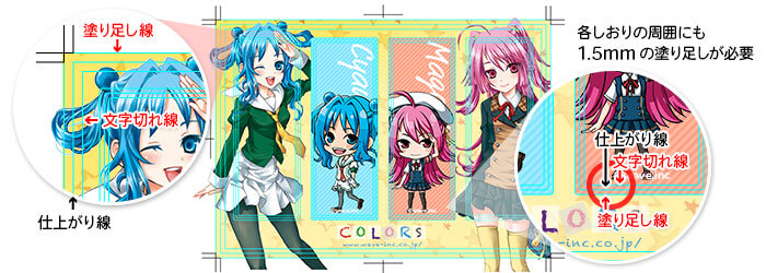 仕上がり線よりも3mm以上塗り足しを作成してください。また切れてはいけない文字やオブジェクトは仕上がり線・加工位置より3mm以上離して配置してください。