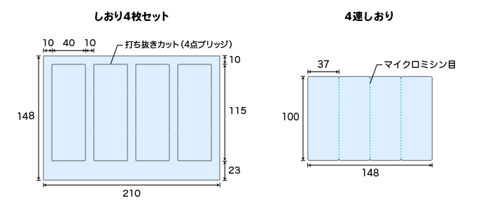 しおりセット印刷のサイズは下図のとおりです。トムソンによる打ち抜き(ミシン目加工)で仕上げます。