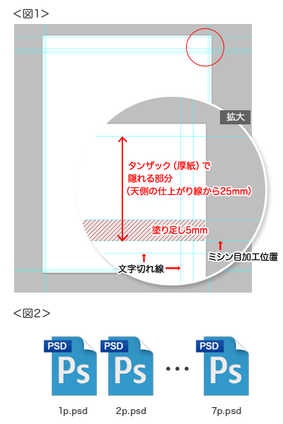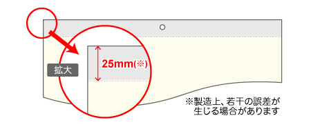 天側の仕上がり線(断裁位置)から25mmは厚紙で隠れます。重要な文字や画像等を配置されない様お気をつけください。