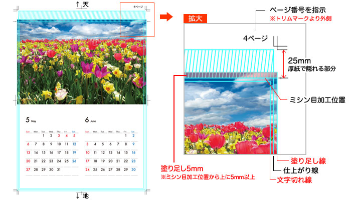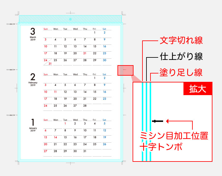 - 2ヶ月・3ヶ月カレンダーを作成する場合は、必ずミシン目位置を加工指示書でご指定ください。詳しくは加工指示書についてをご確認ください。