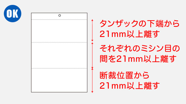 - タンザックの下端(ミシン目加工位置)、断裁位置から21mm以上離して配置。