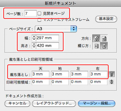 A3サイズ(幅297mm×高さ420mm)を例に新規ページの設定方法を解説いたします。