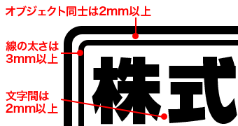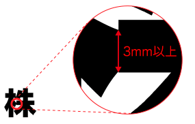 文字の抜き部分や余白など、カッティングシートとして残す部分の最小面積は、3mm角以上の大きさになるよう作成してください。
