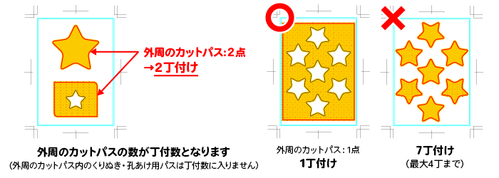 外周のカットパス(打ち抜き用のパス・トムソン罫)の数が丁付の数となります(下図参照)。