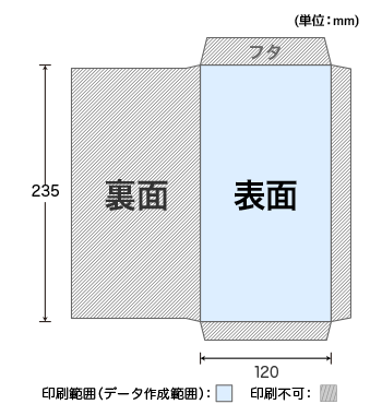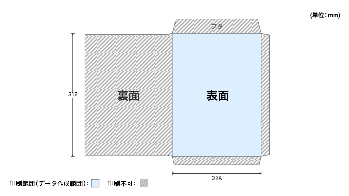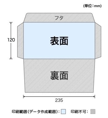 Officeソフトでデータを作成される場合は、片面印刷(外面)のみのご対応となります。また、フラップ(フタ・折り返し部分)と裏面(貼り合わせ面)には印刷することができません。