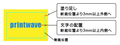 断裁位置から3mm以上はみ出す様に外側へ塗り足しを行い、3mm以上内側へ文字等を配置してください。