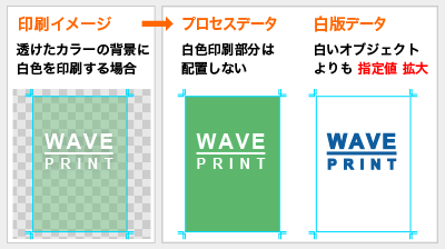 白版データのご入稿がない場合、データ不備となり印刷工程へ進めることができません。また、白版の形状についてはデータチェック項目ではありませんので、白版のデータ作成方法が適切でなかった場合、不備とならずに印刷工程へ進む場合もございます。以下作成ガイドをよくお読みいただき、完全データでのご入稿をお願いいたします。