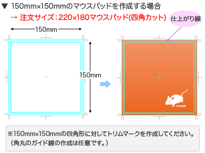 - 150mm×150mmの四角形を作成し、それに対してトリムマークを作成してください。