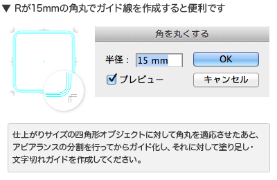 データ作成時に、角丸形のガイド線を作成されると、断裁位置の目安になり便利です。