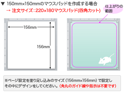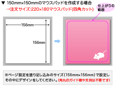 - 150mm×150mmに塗り足し(上下左右3mmずつ)を足したサイズでページ設定し作成します。