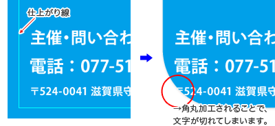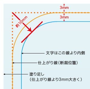四隅の端に文字やオブジェクトを配置される場合は、仕上がり線から10mm以上内側に配置していただくと、角丸加工による文字切れを防ぐことができます。(右図)